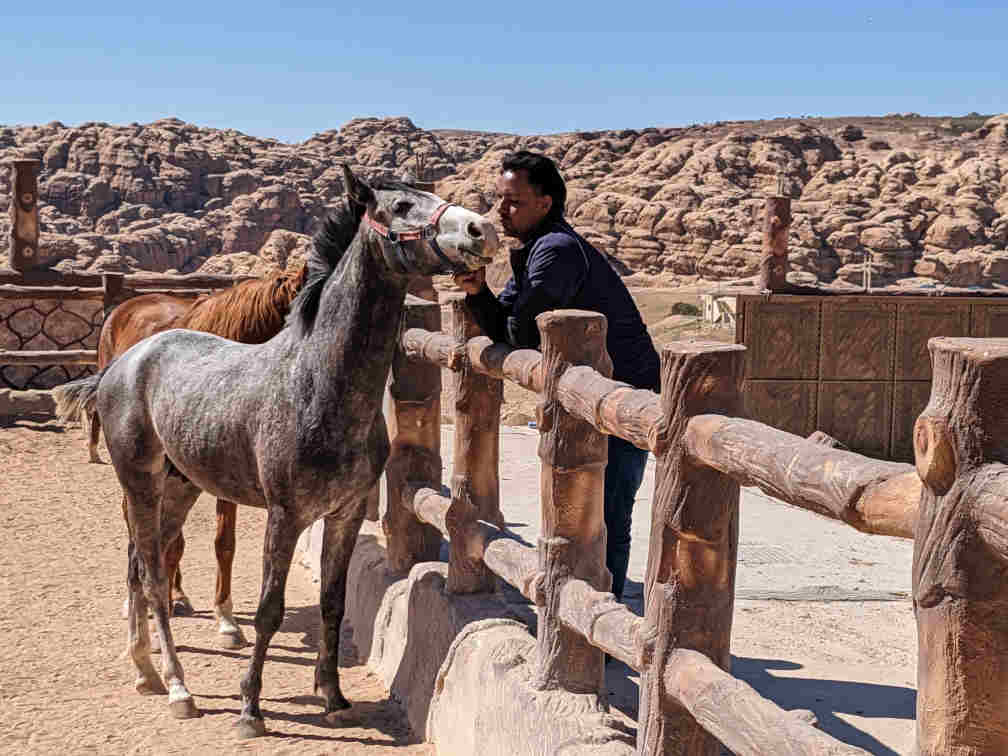 Mountain Horse Stables has clean and safe facilities for humans and horses alike. The Panorama Room and Bedouin tent have views of the horses’ play area and the mountains of Little Petra with comfortable chairs and tables to enjoy coffee, tea, juices, sodas, or shsisha. Stairs to the roof of the Panorama Room take you to a large patio with a 360 degree views of the amazing landscape. This is the ideal place to enjoy the sunset or watch for riders returning.